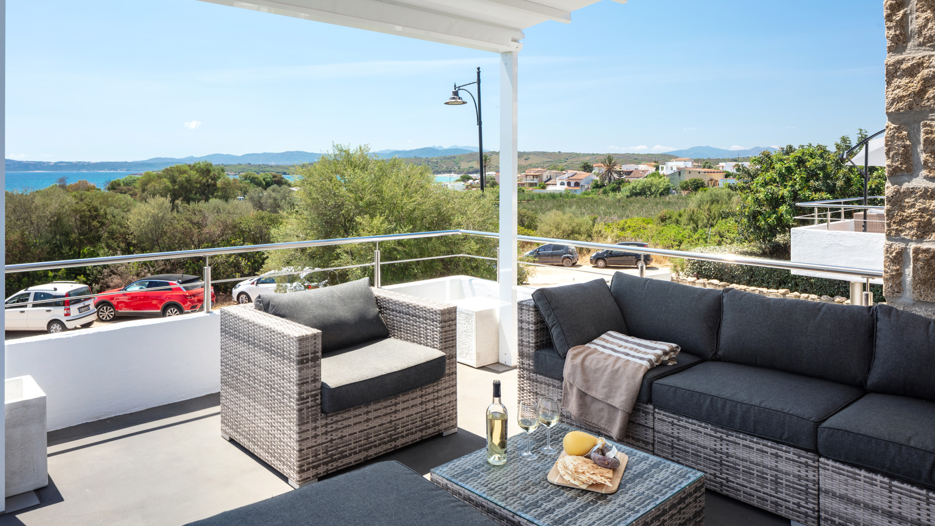 L’appartamento è situato al piano primo con accesso autonomo dall’esterno. Si compone di una camera da letto matrimoniale con bagno in camera ed un soggiorno-cucina con una meravigliosa veranda esterna coperta da una pergola attrezzata dove rilassarsi guardando la spiaggia ed il mare.