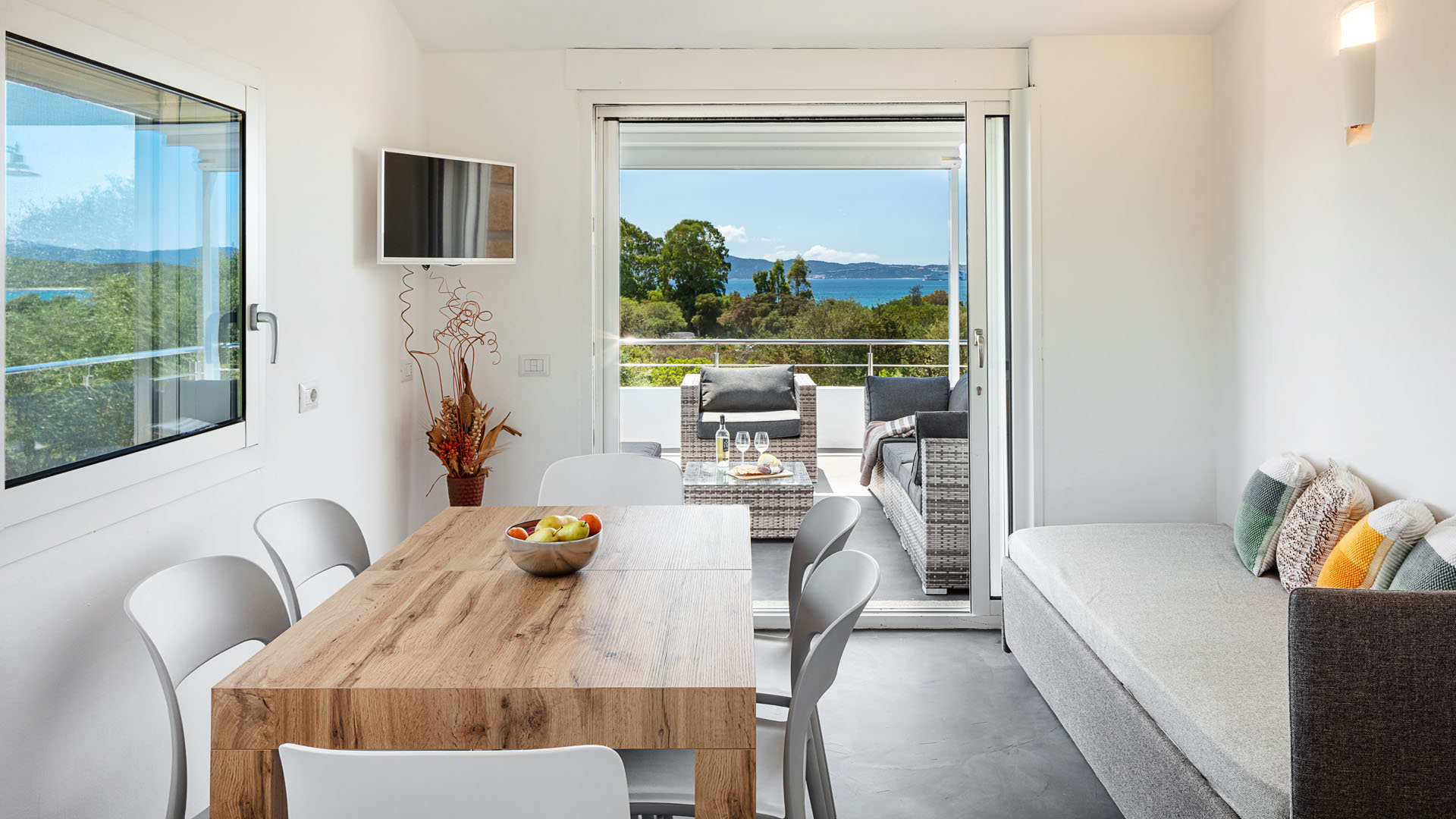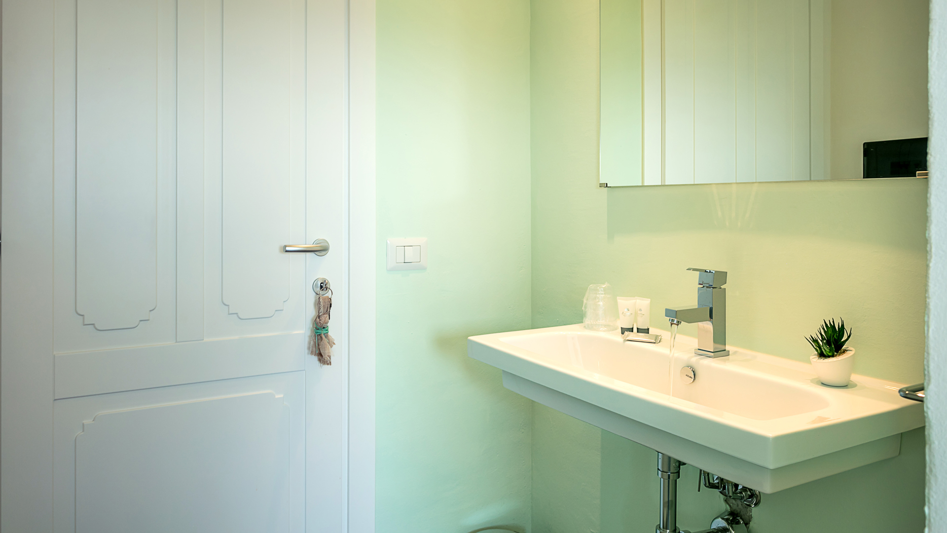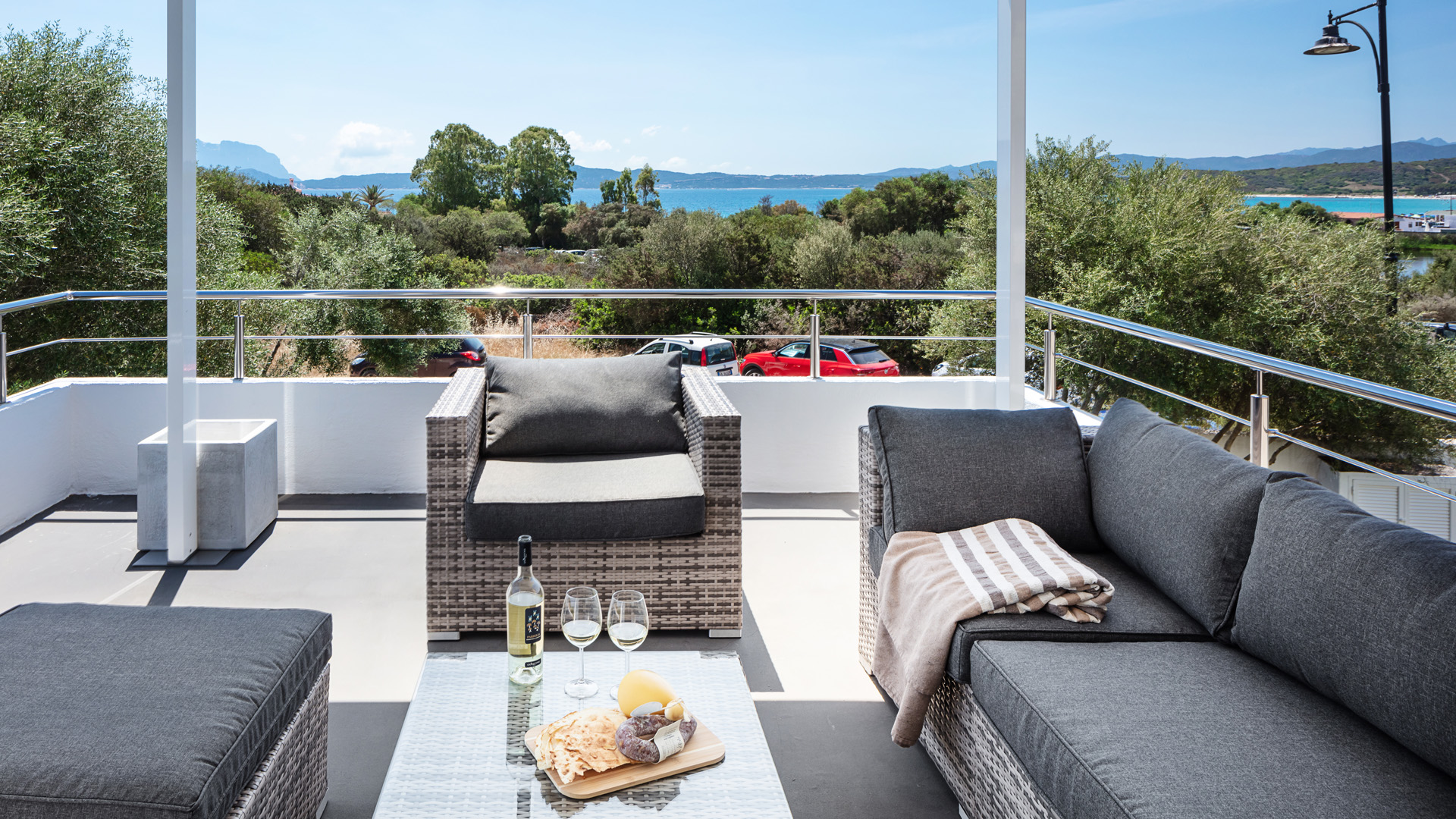 La camera ha una meravigliosa finestra che incornicia il mare e l’Isola di Tavolara. È arredata finemente con letto queen size e “vestita” con tessuti sardi di colore verde.